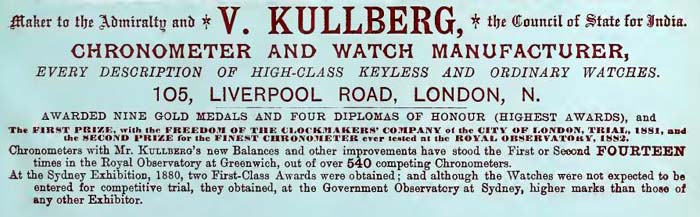 1856 /57 geriet die Chronometerfertigung in London in die Krise. Kullberg machte aus der Not eine Tugend und verselbstständigte sich 1856 in der Liverpool Road /