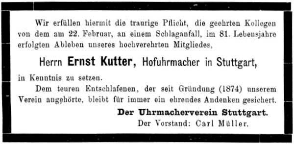 Am 23.02.1905 verstarb er in Stuttgart. Das Geschäft wurde von seinem Sohn (E. Kutter, Uhrmachermeister) weiterbetrieben und im Jahr 1927 an die Familie Möhrle verkauft. Diese führt das Geschäft noch heute unter dem Namen "E.Kutter" weiter. |