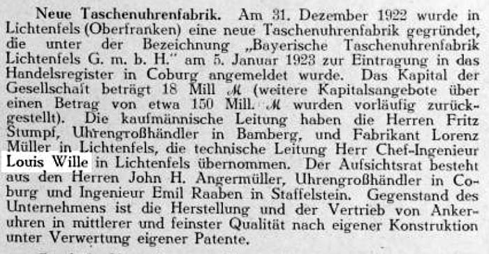 Am 31.12.1922 wurde in Lichtenfels die "Bayerische Taschenuhrenfabrik Lichtenfels GmbH" gegründet. Wille war von Anfang an der Technische Leiter. Die Firma stellte Uhrgestelle im Spritzgußverfahren her. Ausserdem stellte sie Taschenuhren mit Ankerwerken in mittlerer und feiner Qualität her. Uhren der Manufaktur waren mit "Bayern Praezision" oder "Bayern Praecision" gemarkt. Sie beschäftigte 70 Mitarbeiter. |