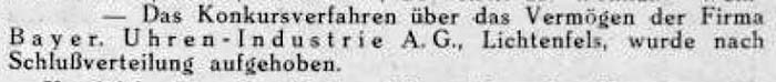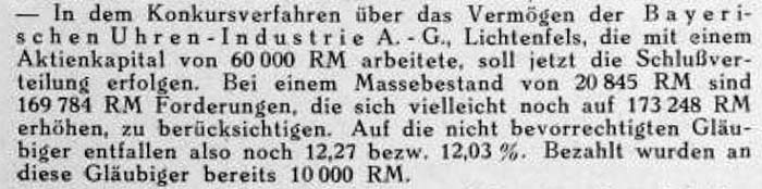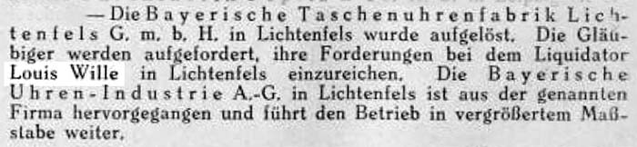1925 wurde die Firma umstrukturiert in die "Bayrische Uhrenindustrie, Lichtenfels". 1932 ging die Manufaktur in den Konkurs. Bereits 1926 siedelte Wille mit einem Stamm von Mitarbeitern nach Pforzheim um, um eine Taschenuhrfabrikation aufzubauen (Drusenbaum). Dieses gelang aber nicht. |
