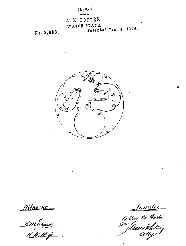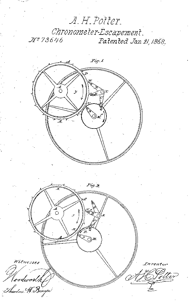 Von Juni 1878 - März 1889 war er zusammen mit Meylan, Ekegren und Jurgensen Mitglied der"Commission de Surveillance de l´Ecole d´Horlogerie". 1880 baute er die astronomische Uhr Nr. 486 mit Mondphase und ewigem Kalender. Potter beschäftigte sich hauptsächlich mit den Hemmungen und der endgültigen Fertigstellung seiner Uhren. Die Rohwerke bezog er von der Firma Rannaz Co. Einige seiner Patente verkaufte Potter an andere Manufakturen. Diese gelangten auf diesem Wege zur New Haven Watch Comp., welche ja in die Trenton Watch Company überging. Allerdings wurden diese Uhren nie gebaut. Somit konnte Potter die Rechte an die Manufaktur J.J. Badollet & Cie in Charmilles weitergeben. Daraus entstanden die "Charmilles"-Uhren. |