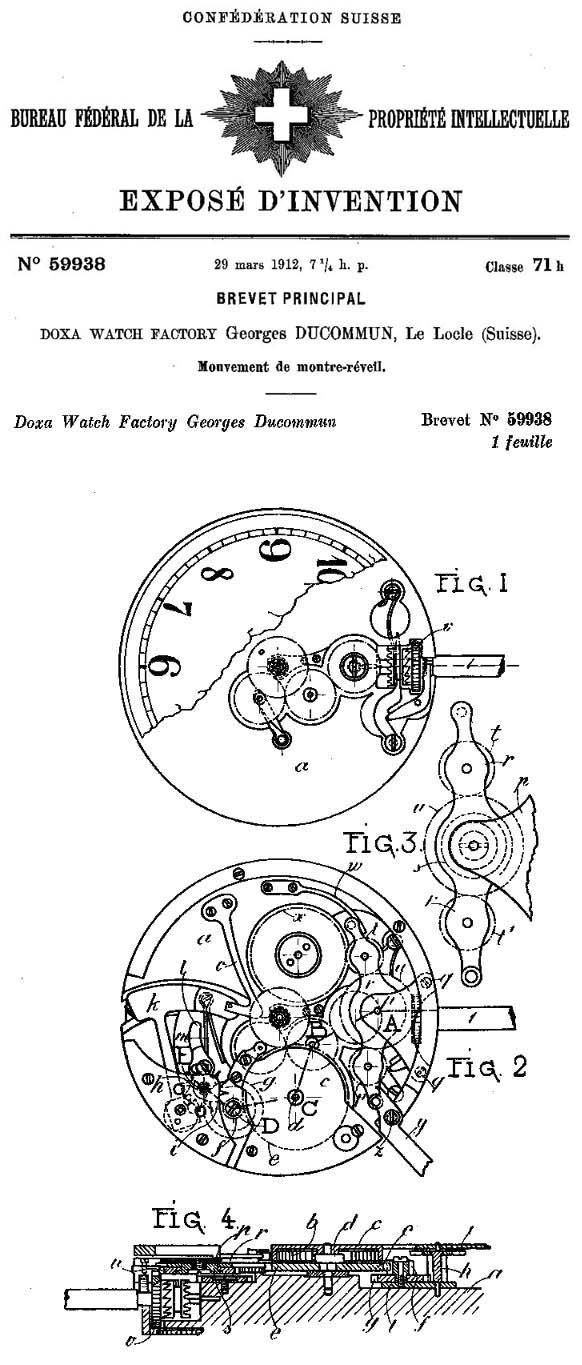 Im Jahr 1889 wird die Manufaktur "Doxa" in Le Locle von Georges Ducommun (1868-1936) gegründet. Georges, eigentlich Georges Arthur Ducommun-dit-Verron, wuchs in ärmlichen Verhältnissen mit 12 Geschwistern auf. Bereits im Alter von 12 Jahren war er daher gezwungen zum Lebensunterhalt der Familie beizutragen. Er war angestellt in einem sogenannten Etablissage-Betrieb, welcher ist nicht bekannt, und kam damit mit der Uhrmacherei in Berührung. Seine Aufgabe bestand darin Uhrwerke in Gehäuse einzuschalen. Die an sich langweilige Tätigkeit schien ihn inspiriert zu haben, denn nachdem er sich selbstständig gemacht hatte meldete er mehrere Patente bzgl. Uhrenghäuse an: 13727 (1897) und 13729 (1897). Aber auch nach seinem Abbleben fiel die Firma Doxa mit Innovationen von Uhrengehäuse auf. |