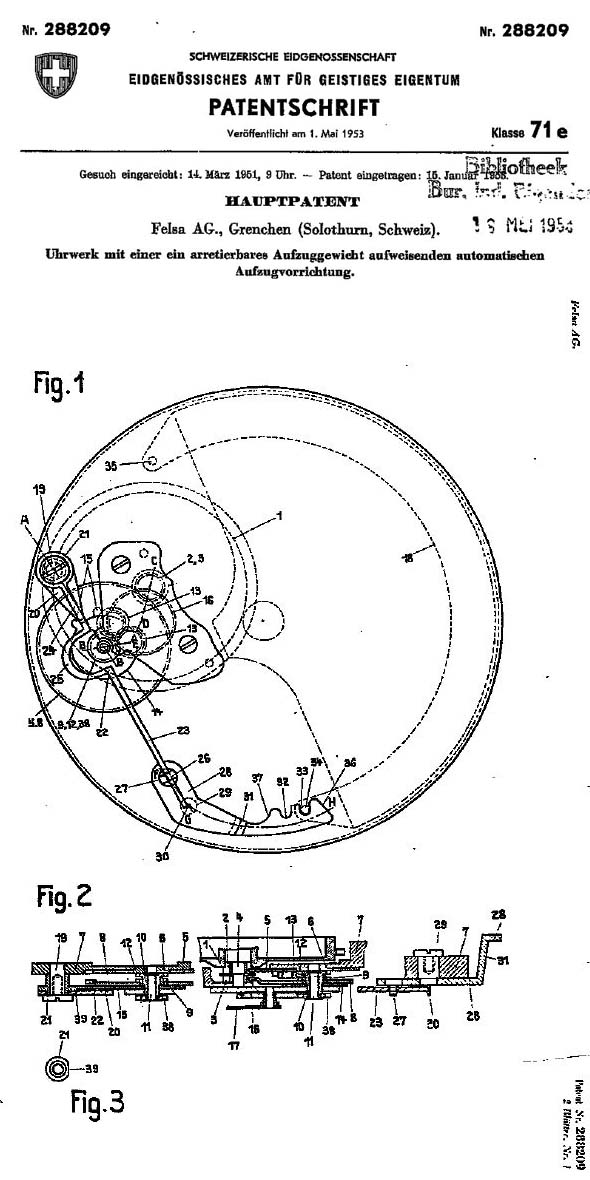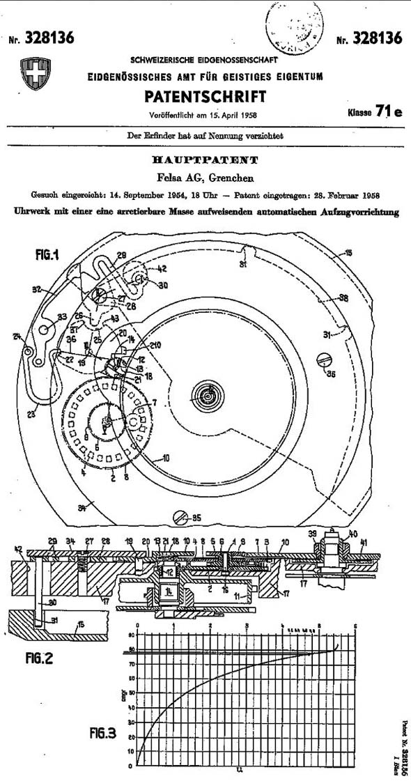 Ein weiteres Uhrwerk, welches sehr bedeutend für die Uhrmacherei war ist das Kaliber 1565 namens "Inversator" (11.5'''; 30 Jew.; 18000 A/h; GR 42h; Gangreserveanzeige). Es handelt sich dabei um das erste Automatikwerk, welches ohne Schleppfeder auskommmt. Die gleichbleibende Federkraft wird durch ein Differential zwischen Federkern und Federhaus erreicht (Patent 288209 und 328136). Bei Vollaufzug ist der Rotor blockiert. |