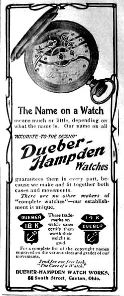 1923 folgte der endgültige Zusammenschluß zur "Dueber-Hampden Watch Company". Zu dieser Zeit waren 3000 Menschen bei der Firma angestellt.