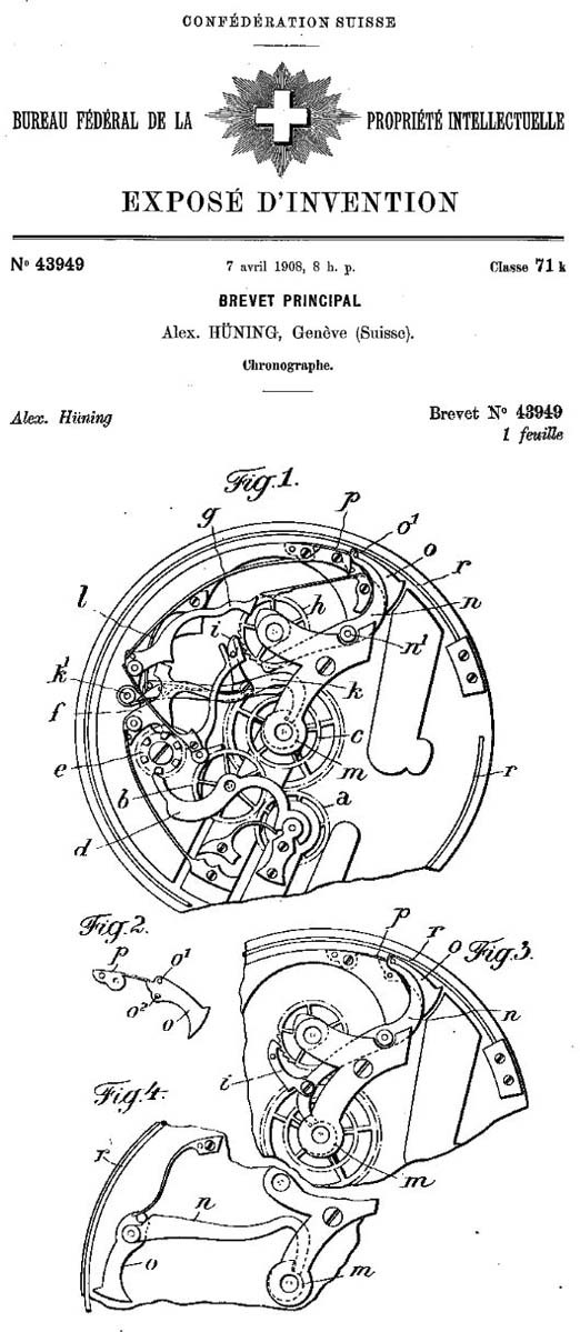 Weitere Erfindungen sind Nr.80550 aus dem Jahr 1918 und auch ein Patent zur Chronographensteuerung Nr.43949 aus dem Jahr 1908 (Abb. s.o.).