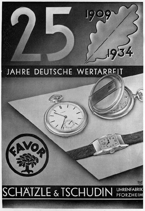 Die Firma wurde 1909 in Weil am Rhein gegründet und war die erste Manufaktur Deutschlands, die Taschenuhrenrohwerke herstellte. Sie war hier in der Hauptstrasse 18 angesiedelt. Ab ca. 1920 erfolgte im neu eröffnetem Zweigwerk Pforzheim, Zerennerstr.55, die Weiterverarbeitung zu fertigen Uhren. Die Uhren wurden unter den Uhrenmarken "Favor" und "Unidor" vertrieben. Das Markenzeichen war "S & T". Zum Namen Schätzle ist wenig bekannt. Bei Tschudin vermute ich verwandschaftliche Beziehungen zur Schweizerischen Sippschaft. Dieses wird auch dadurch bestätigt, dass aus dem Stegreif hochwertige Uhren produziert wurden. Der Hauptabnehmer des Kalibers 6 (18''', Sav.) und 14 (18''', Lep.) war die Alpina Deutsche Uhrmacher-Genossenschaft GmbH. |