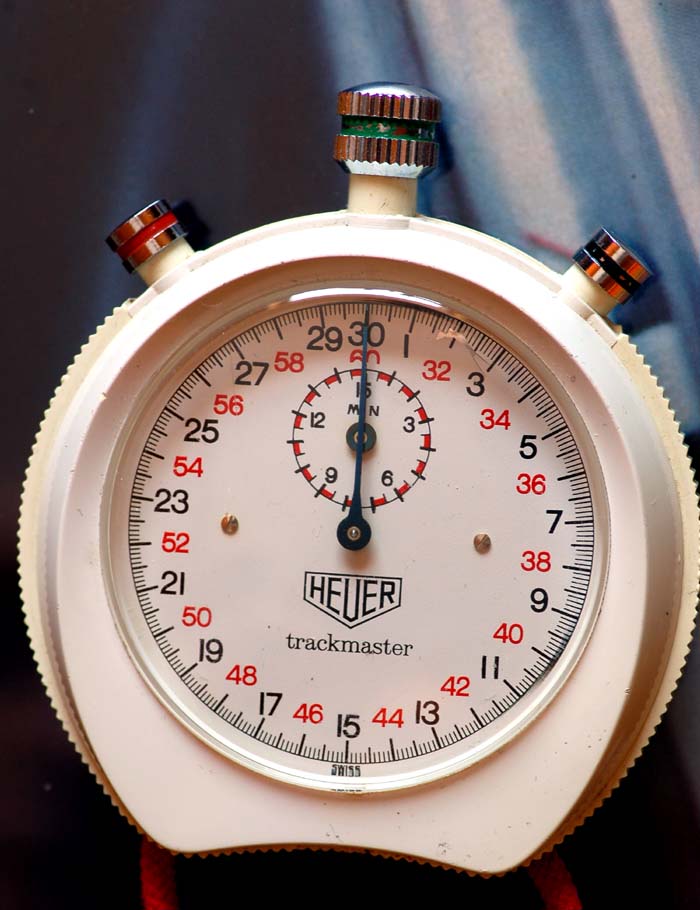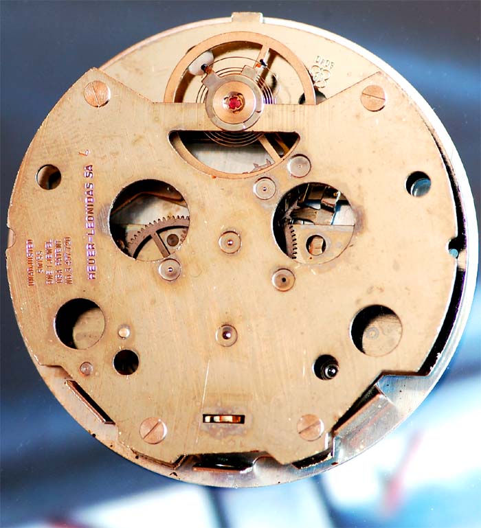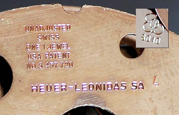 Die Uhr ist von einfachster Bauart und in einem Kunstgehäuse eingeschalt. Das Werk ist mit "Heuer-Leonidas SA" gemarkt. Diese Marke ist ja durch den Zusammenschluß von Heuer und Leonidas im Jahr 1964 entstanden und existierte bis 1985. | ||