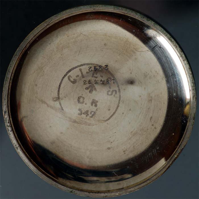 Auf dem Rückdeckel innenseitig findet sich die Stempelung: "C-I-E-S-S, Broad Arrow, C.R. 547" im Kreis ("CR" = Chronometer). |