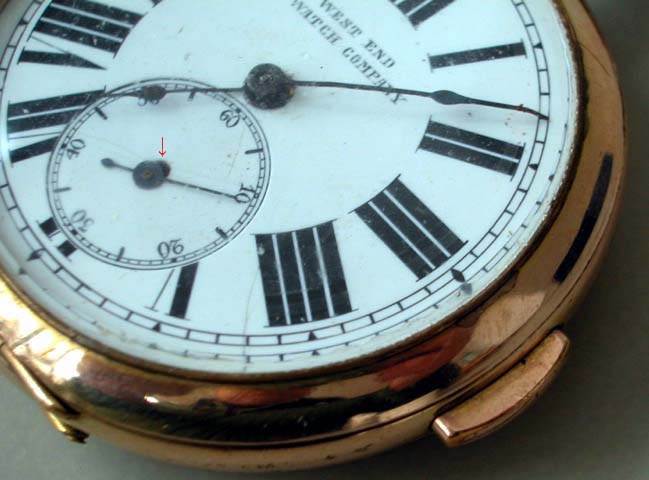 Bei dieser Uhr ist das Originalzifferblatt durch ein Unpassendes ersetzt worden. Eindeutig sichtbar wird es an dem kleinen Sekundezeiger, der dezentral sitzt. |